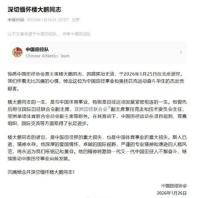 楼大鹏逝世曾担任北京申奥主要陈述人九游体育1月26日晚,中国田径协会发布讣告:惊悉中国田径协会原主席楼大鹏同志,因病医治无效,于2026年1月25日在北京逝世。我们怀着无比沉痛的心情,悼念这位为中国...01-28 / 2026